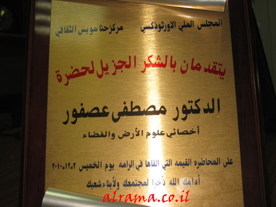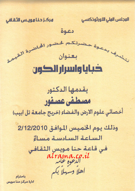 استضاف مركز حنا مويس الثقافي بوم الخميس الموافق 2010-12-02 الدكتور مصطفى عصفور, اخصائي علوم الكون والفضاء حيث اتحف الموجودين بمعلومات قيمة جداً وهامه جدً تختص بسير وحركة الاجرام السماوية والارض والشموس التي لا تعد ولا تحصى والتي خلقها الباري عز وجل خصيصا لخدمة الانسان وتوفير الظروف المناسبه لخدمة وبقاء الانسان على وجه الارض.
