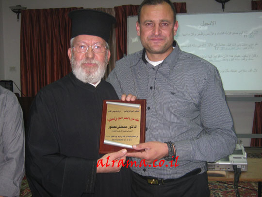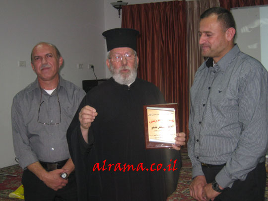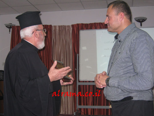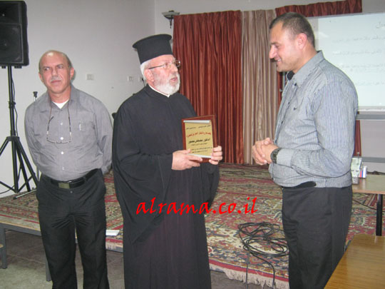 وفي النهاية قدم قدس الاب جوارجيوس حنا والسيد مشيل داوود, رئيس المجلس الملي الاورثوذوكسي درع مركز حنا مويس الثقافي الى الضيف العزيز.
