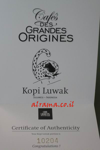 ولو اقتربنا قليلاً من الشهادة كي نراها .. ونجد عليها صورة الكيفيت .. والبلد المنتجة هي إندونيسيا .. واسم القهوة مكتوب .. كوبي لواك.
